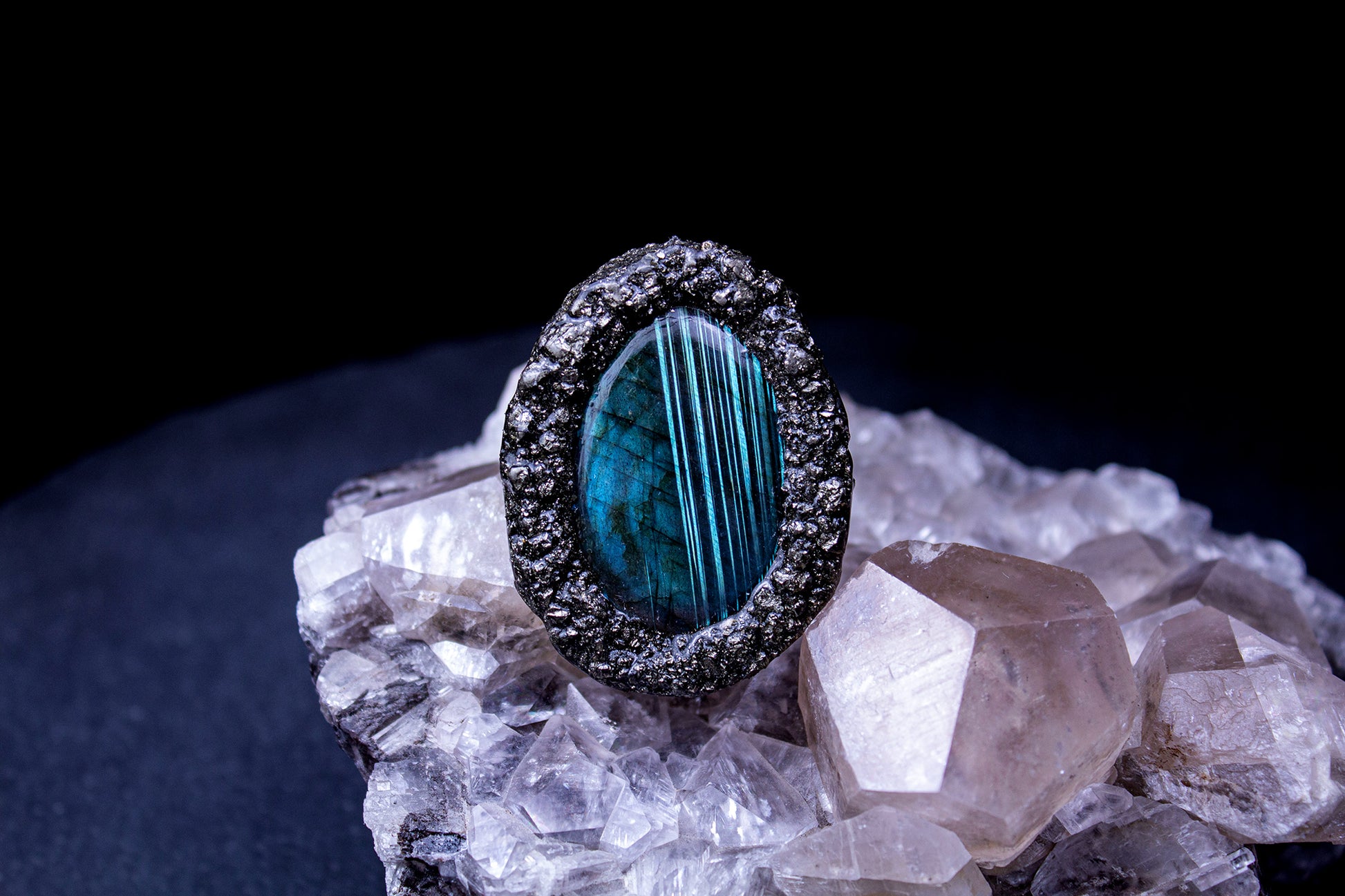 Gemstone: Labradorite, Pyrite. The pyrite has been treated with a protective sealant to ensure its brilliant finish and secure setting.
